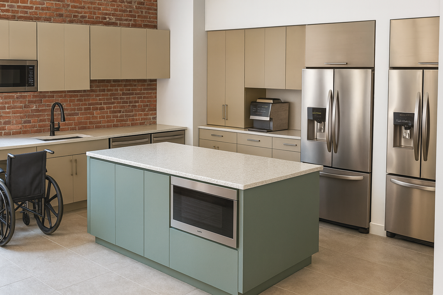 Working alongside forward-thinking, community-engaged Urban Systems on their office renovation, our top of mind was ensuring that no staff member or visitor would feel uncomfortable engaging with the spaces around them. People with physical, visual, auditory, sensory, and neurodiverse differences needed to be heard and engaged during the planning process (kudos to USL). In addition to code requirements, we considered generous spacing and accessibility around lunchroom appliances (microwave drawer and fridges), colour contrasting at doors and in washrooms, hand-wave motion sensors in the boardroom, and other physical considerations.